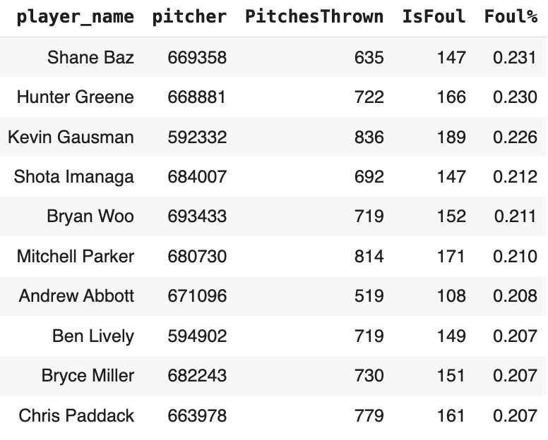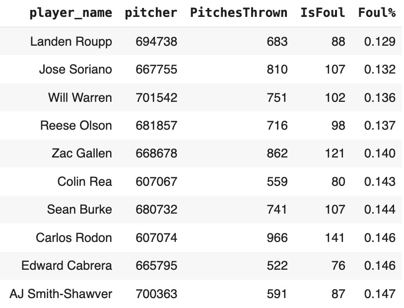 Foul ball stuff is something I’ve never really given a close look to. I’ve wondered in the past if certain pitchers generate foul balls at a higher rate than others. It would make some sense that a foul ball is the result in between hard contact and a whiff, right? The hitter usually doesn’t want to hit a foul ball. It’s a mishit, which is a good outcome for the pitcher, but the pitch wasn’t quite so good to get a full out whiff.