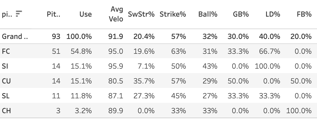 Dylan Ray (ARI): 94 Pitches, 6IP, 5H, 2ER, 7K, 0BB, 24FPts