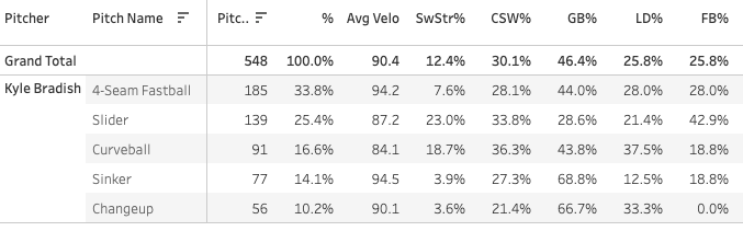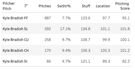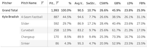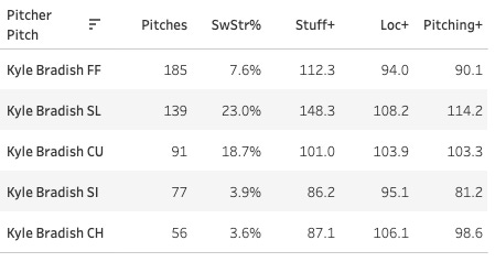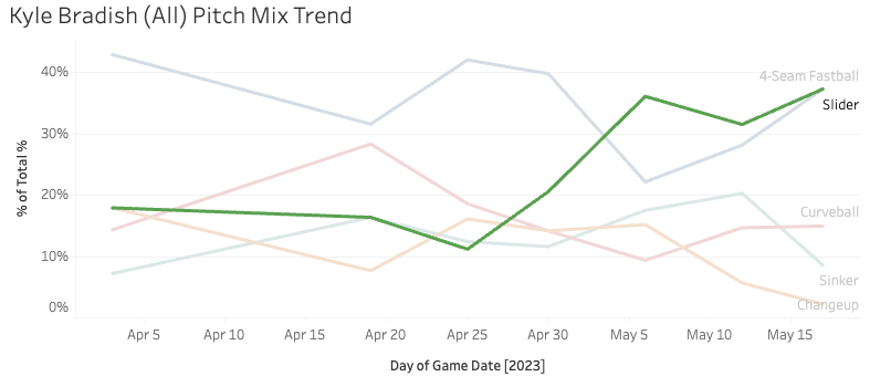 Kyle Bradish's SL usage (37.2%) up 14.3 points