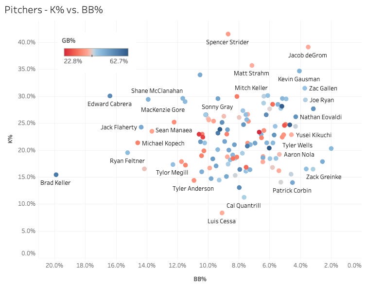 A more general concept to highlight is what powers the Magic Formula Qualifiers for pitchers. The three stats I most often look at and cite here for pitchers are K%, BB%, and GB%. You know I love scatter plots and I try to showcase all three of those stats using the K% vs. BB% scatter plot on the main MLB dashboard.
