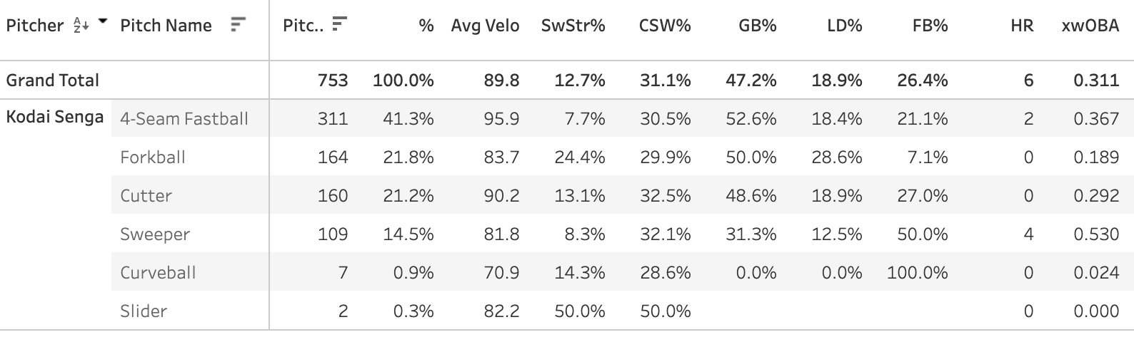 For the year, he has a 21% K% with a 7% BB% on a 12.4% SwStr% and a 46% GB%. That has kept the xwOBA down to .310, which is very good - but not guaranteed to stick around.