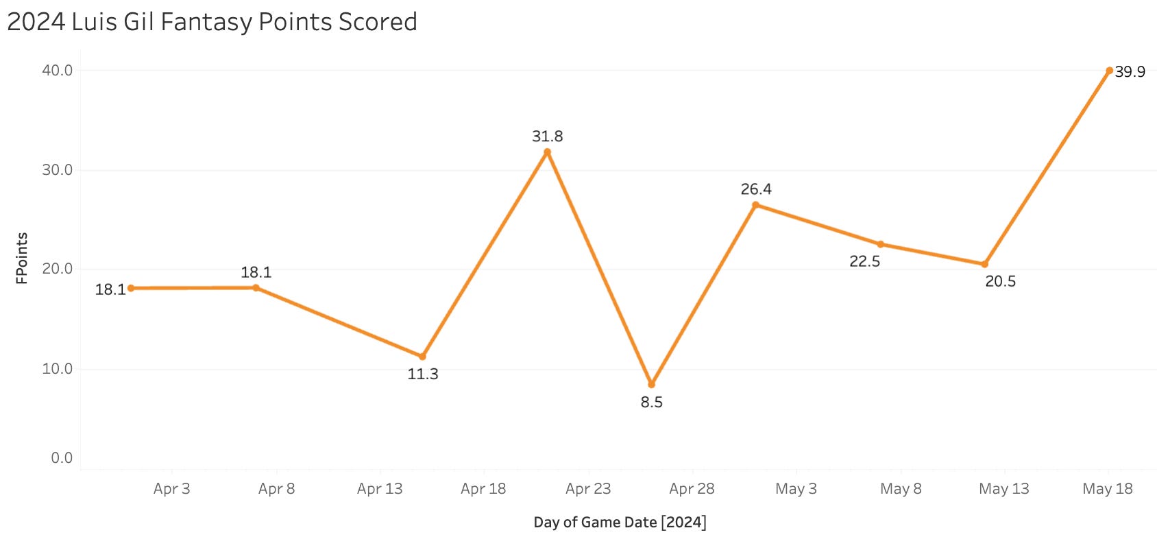 1. Luis Gil (vs. CWS): 39.9 Points