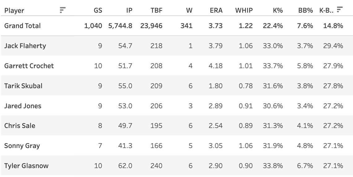 Jack Flaherty - 94 TBF, 38.3 K%, 4.3 BB%, 50.0% GB%