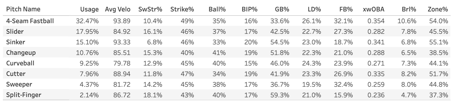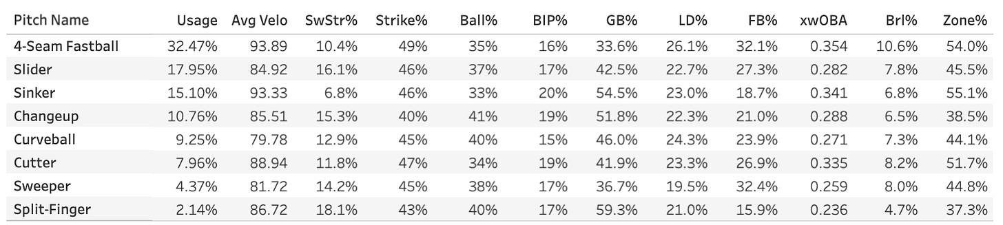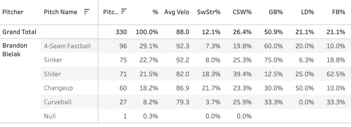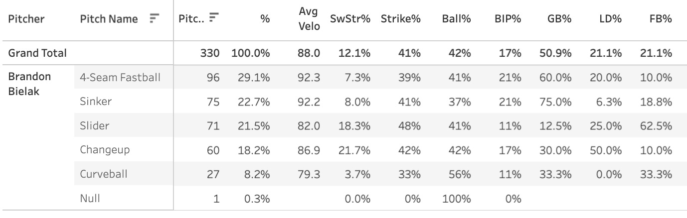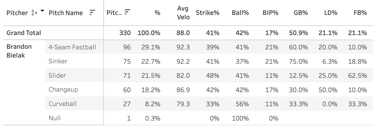 If you’re going to have a bad fastball, you might as well have two different grips on it - which is what Bielak is doing with the four-seam and sinker. I’m actually going to change these pitch arsenal tables to include Strike%, Ball%, and BIP%. I’m going to do that RIGHT NOW and then re-post that screenie.