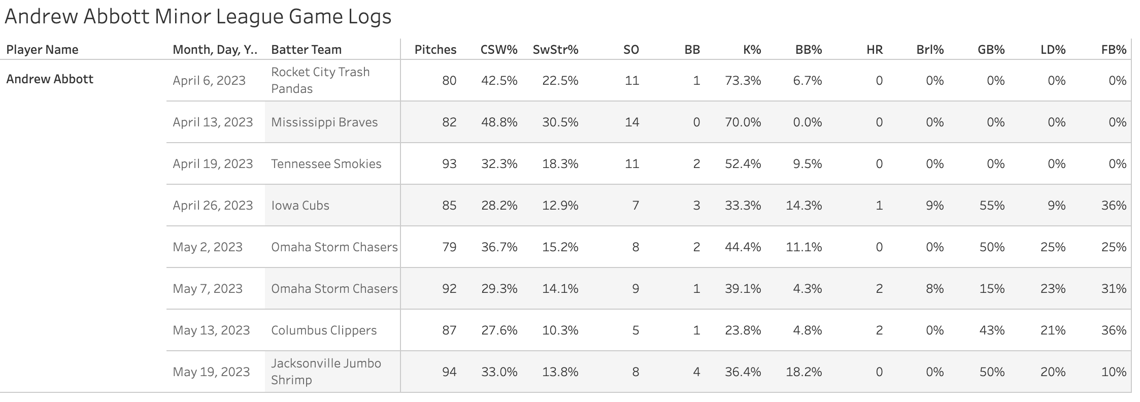 You can see that in his first three games, there is nothing there for Brl%, GB%, LD%, or FB%. That is because those games were in AA where they don’t capture that data, but the K% and BB% (zone%, strike%, and ball% will be added to this soon) are there because we are getting the pitch-by-pitch data now everywhere. Hope that makes sense, go check out the new dashboard - there’s a ton of stuff in there for you minor league fans.