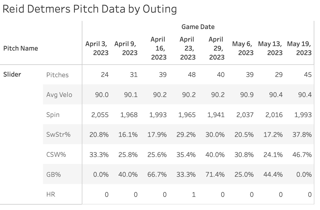 Reid Detmers was also very good last night with a silly 38% SwStr% on his slider. Here’s how that pitch has performed throughout the year:
