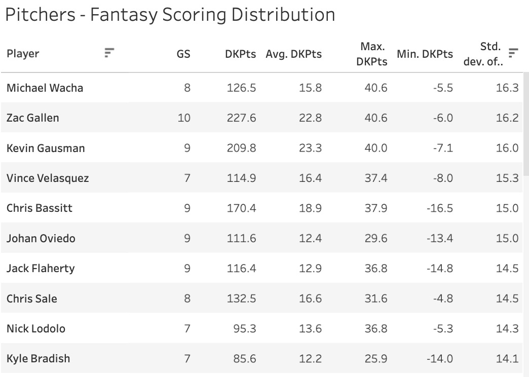 Because of that, he doesn’t show up high on the standard deviation of fantasy scoring list, here are those leaders from this year: