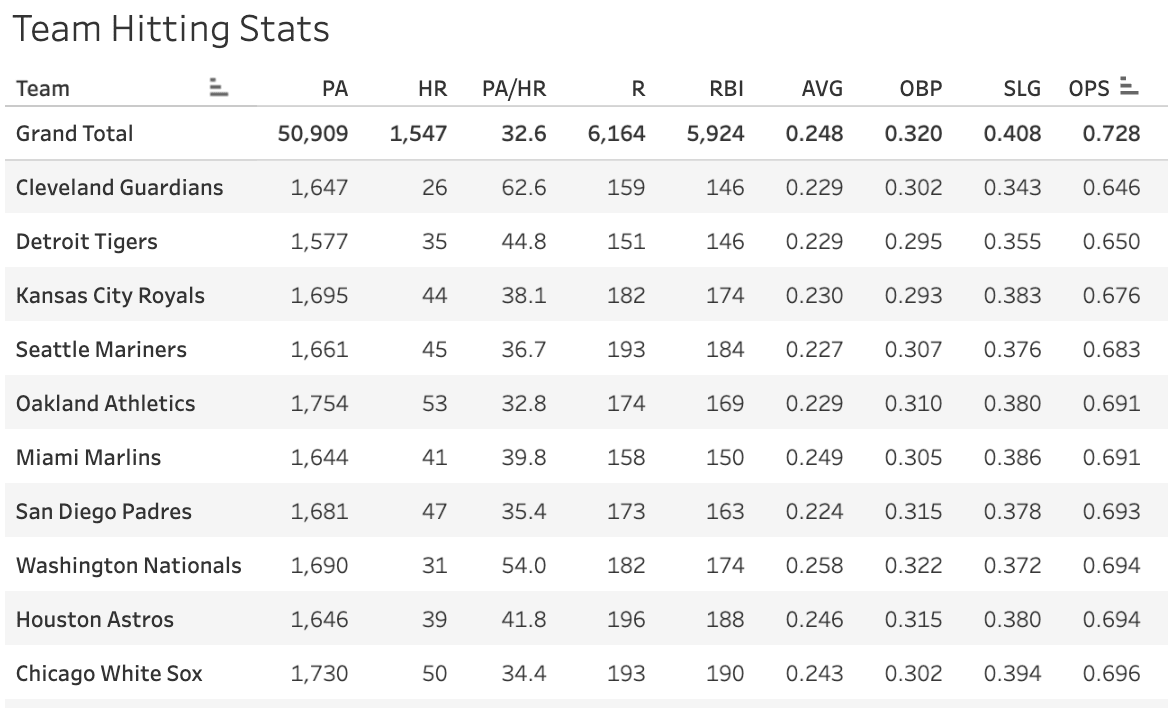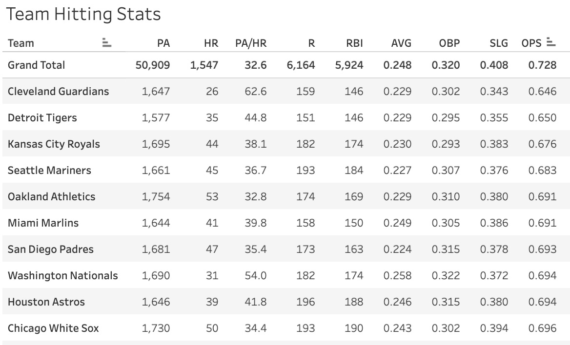 That reminds me to give an update on the team hitting stats, here are the league’s worst team OPS marks.