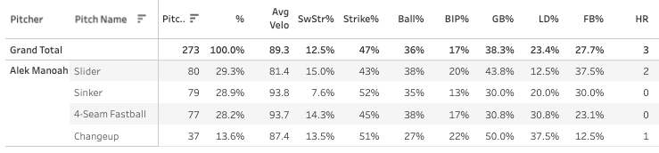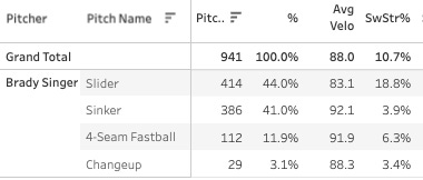 Throwing a lot of sliders. I wouldn’t call it wise to lead your pitch mix with a 43% Strike% pitch, but the sinker and four-seamer are right there with it so it’s a pretty much evenly-distributed three-pitch mix with the changeup available.