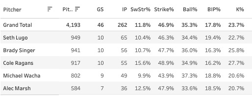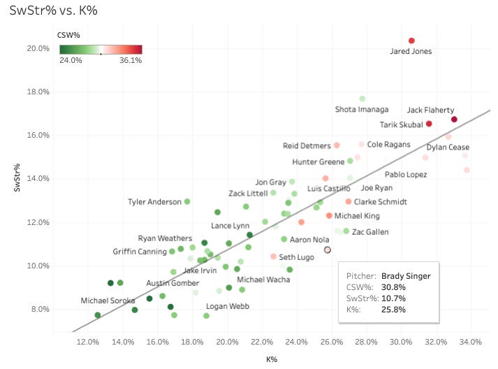 If we look at all pitchers in the league this year with a SwStr% between 10% and 11%, the aggregate K% is 20%. So Wacha is right on track with that, but Lugo is beating it by three points and Singer is absolutely crushing it by six points.