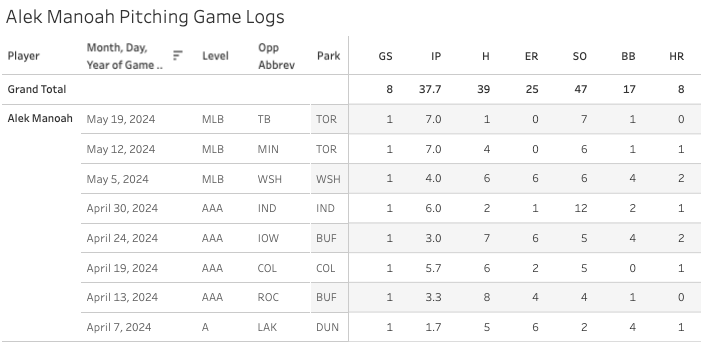 Oh boy! Manoah now has thrown 14 shutout innings in his last two starts with 13 strikeouts and two walks. Here are his game logs, including the minor league work: