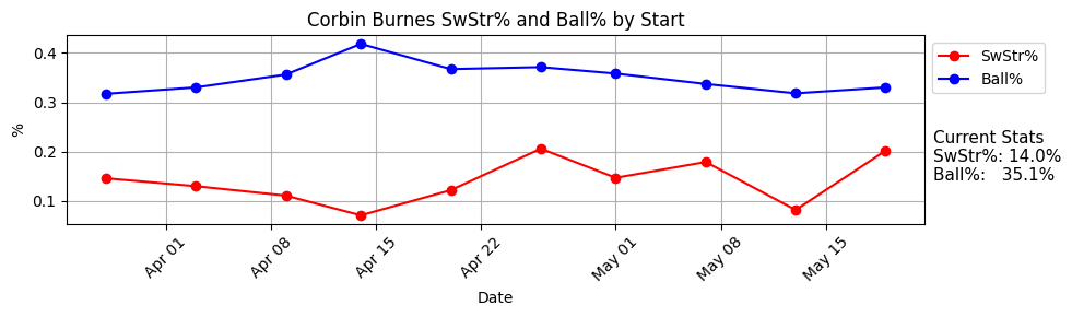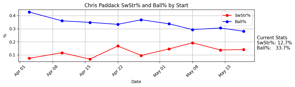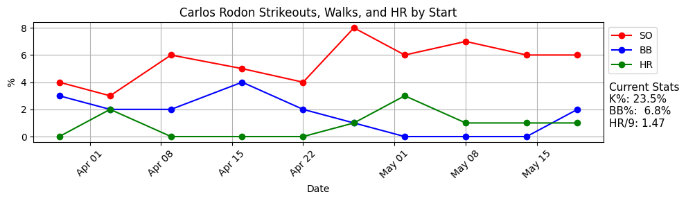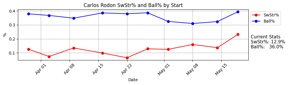 I really did not expect to be sitting here on May 20th and seeing Rodon completely healthy with a 12.9% SwStr%. He has always been one of the best whiff-generators in the league when healthy, but that does not seem to be who he is anymore. You see that it’s improved over these last three starts (17.6% SwStr%), but the ball rate has gone up a bit with it (34.2%). Over these three he has a 25.3% K% and 2.7% BB%, which is a great K-BB%, but even still - not the super high strikeout rate we’re used to.