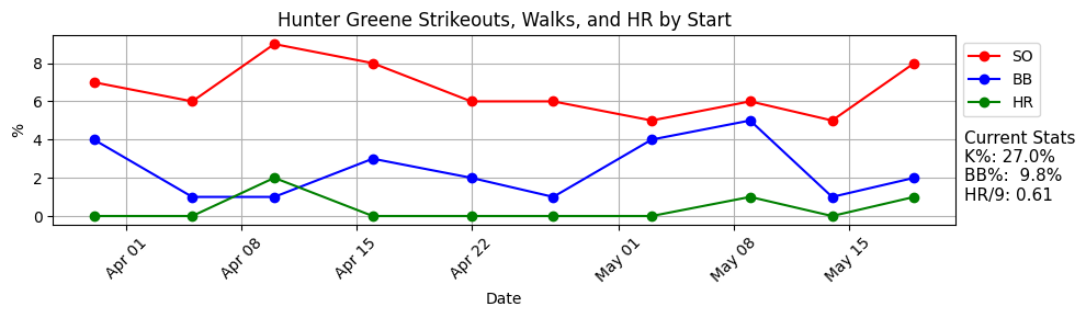 The book on Greene has always been that he gets a lot of all three of those categories - strikeouts, walks, and home runs. Any pitcher that can go out and strikeout 10 hitters will have some excellent starts, but any pitcher with a high walk rate and a home run problem will have some bad starts. And that’s pretty much what we’ve seen from Greene in his young career. But last night was a good one. The season stats we care about: