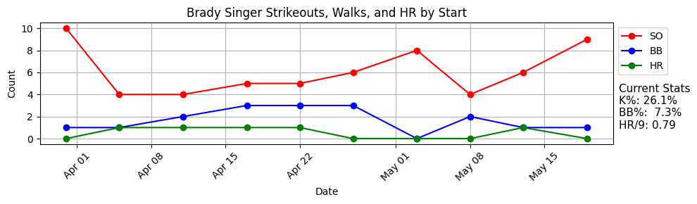 The K% on the season is now a strong 26.1% K% and the walk rate is good at 7.3%. The difference-maker here is probably the ground ball rate () which has led to just a 0.79 HR/9. I think he can sustain a very low HR/9 given the home park and the ground balls, so Singer is a useful enough pitcher.