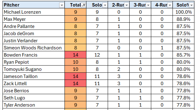 Michael Lorenzen has given up nine homers, all solo jobs. Very lucky there. Bowden Francis might take the take with 12/14 being solo jobs. And giving up 14 homers already is a ton. Scary stuff.