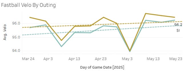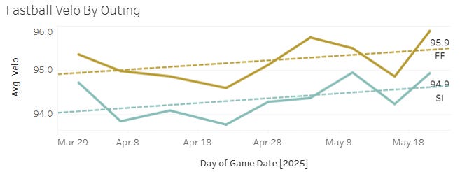 Weird dip there, but he’s been back to his normal velo for three straight outings since then. For the year:
