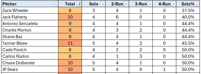 All all pitchers with 8+ homers allowed this year, he’s tied for eighth with the highest solo home run rate in the league. Here’s that leaderboard: