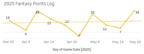 May has been mostly mediocre this year with a 4.09 ERA and a 1.24 WHIP. He’s given up six homers, and at least one homer in his last four starts. There’s only been three times he’s exceeded 20 fantasy points. So I’m not saying he’s a must-own guy in a standard league, but it’s good to see him piling up some strikeouts in these last two starts.