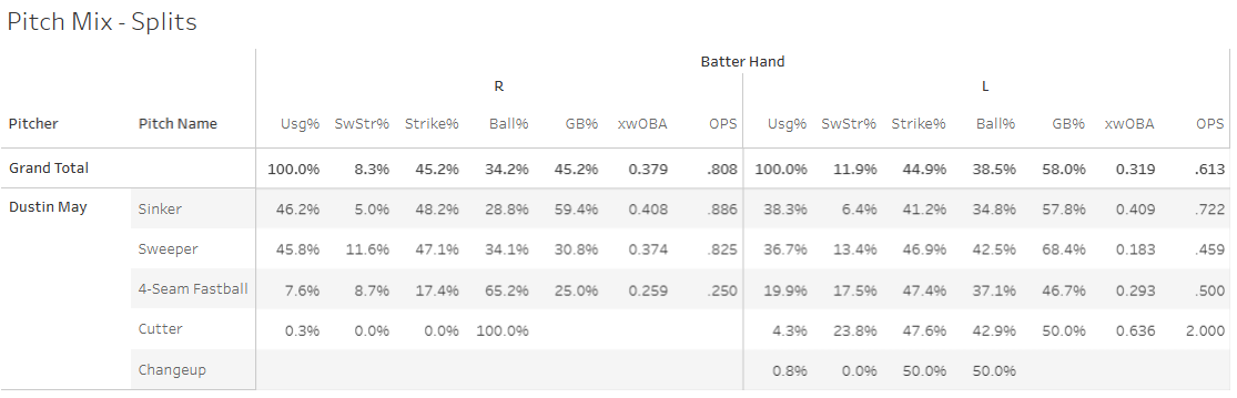 In the case of Dustin May, it’s making me once again wonder why he doesn’t throw the four-seamer more. He’s only thrown it 23 times against righties this year. It works well against lefties (17.5% SwStr% on 97 pitches), so why wouldn’t it work well against righties? Maybe there’s a reason, there probably is.