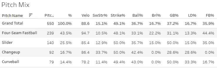 First 7 starts: 19.9% K%, 10.8% BB%, 10.4% SwStr%, 44.2% Strike%, 2.07 WHIP+