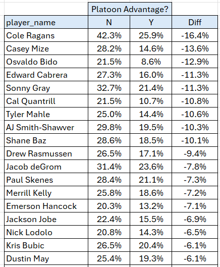 But here are your pitchers who are striking out opposite-hand hitters at least five points in K% than the same-hand.
