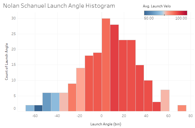 We can now say that he has one of the slowest swings in the league at 66.93 on average (when filtering out bunts and stuff). If you’re going to be a light swinger, you really want to hit a ton of line drives, and Schanuel hasn’t done that with a 52% GB%.