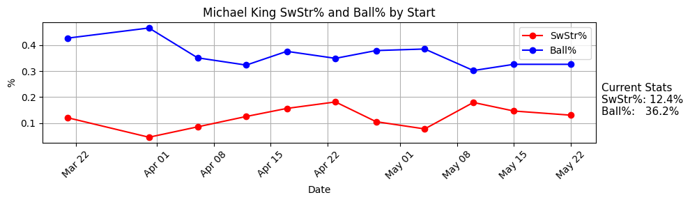 The 4.28 ERA and 1.31 WHIP for the year are bad, and the 12.4% SwStr% and 36.2% Ball% are pretty mediocre as well. It’s really not what people were hoping for in King’s first season as a starter after that breakout performance last year with the Yankees.