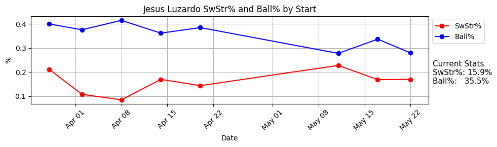 Over these last three he has a 30% Ball% and an 18.7% SwStr%, fantastic marks. Last year in his breakout year he posted a 15.2% SwStr% and a 35.7% Ball%, and if he can replicate that again this year it should be a good year provided health. Luzardo was drafted as a top-20 SP, and that was looking pretty bad early on but he’s pitching like that over the last three weeks for sure.