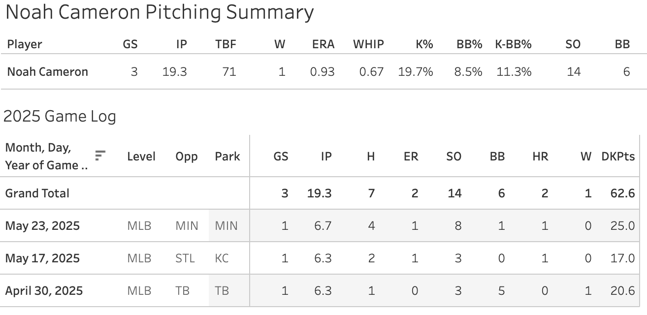 Noah Cameron proved me wrong from what I wrote in the slate preview. He has now put down three very good starts for the Royals.