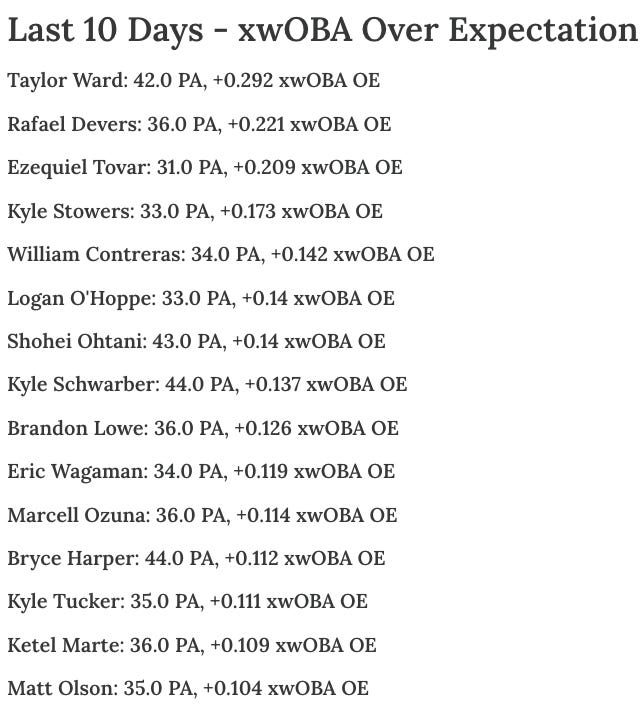 Taylor Ward - 0.457 xwOBA, 20.9% Brl%, 85.1% Contact%, 18.9% Chase%, 22.2% K%