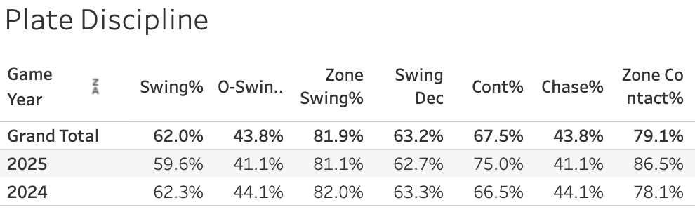 We have seen him swinging a little bit less this year (62% → 60%), and also chasing a little bit less (44% → 41%). Both numbers are still very high. The in-zone contact rate has shot way up, though (78% → 87%). So that’s a very good thing to see. I’m sure he’ll still have some slumps, as any high swing rate hitter will. His EV90 is up from 103 to 105.3 this year, so that’s another good sign.