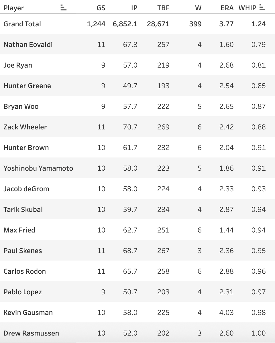 Here’s your list of pitchers with 7+ starts and a WHIP <= 1.