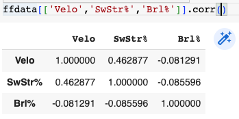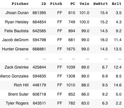 ffdata.columns=['Pitcher','ID','Pitch','PC','Velo','SwStr%','Brl%']