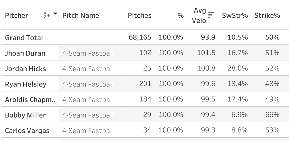 That gives Miller the 5th-highest average velo on a four-seamer this year, including relievers: