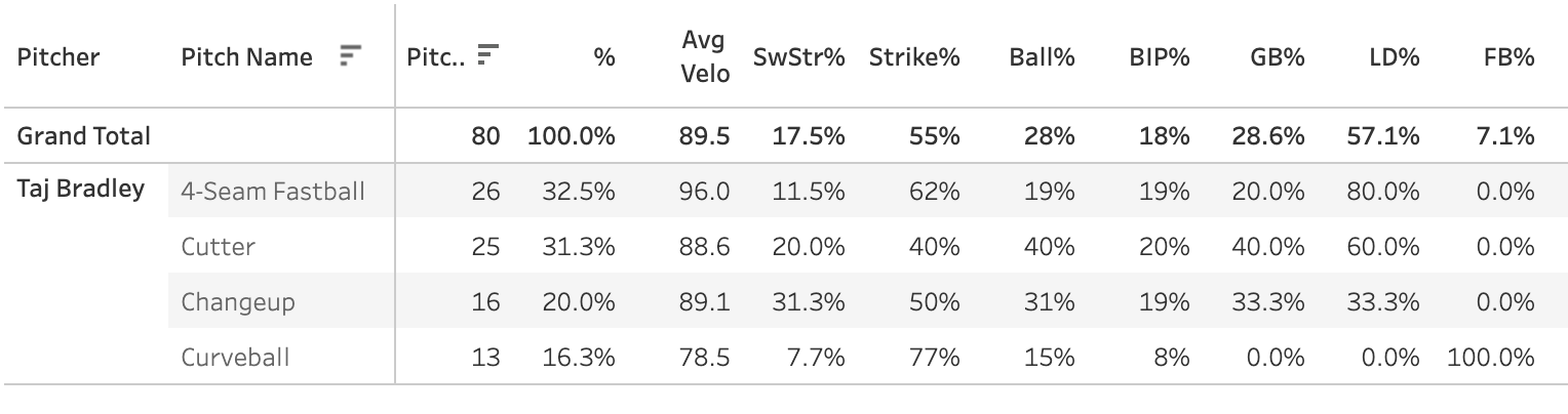Taj Bradley....…………....(TB)....80 Pitches....17.5 SwStr%...55.0 Strike%...27.5 Ball%...17.5 BIP%