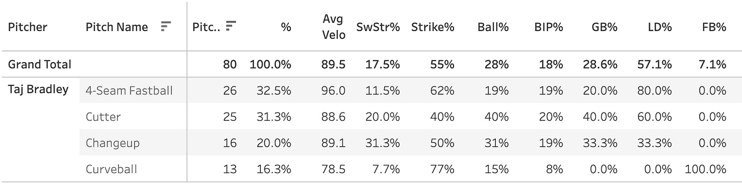 If I just told you that and you didn’t know what Bradley’s line was, you’d actually be a bit relieved that he only gave up four earned runs. He even had a sweet 7:0 K:BB ratio. There was plenty to like in that start: