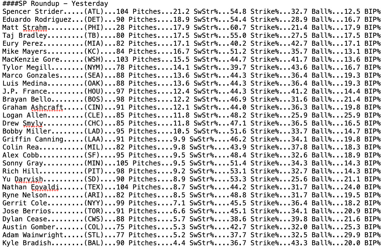 I’m trying something new today as you’ll see right away at the top of the report. I tried to get a readable table of every SP from yesterday to show their SwStr%, Strike%, Ball%, and BIP%.