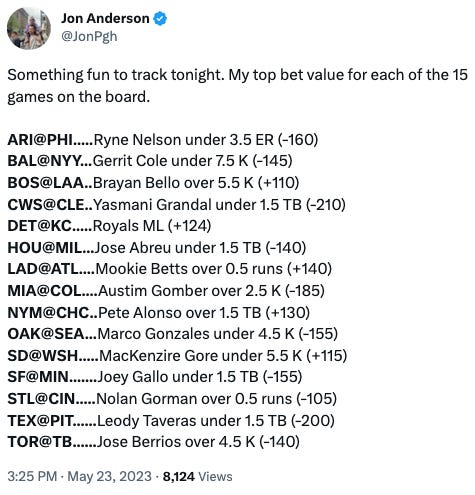 Anyways if you’re into MLB betting I do think the paid Sub here is well worth the $7/month just for that stuff alone - to say nothing about all the other stuff.
