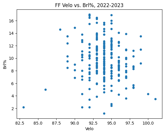 ffdata.plot.scatter(x='Velo',y='Brl%',title='FF Velo vs. Brl%, 2022-2023')