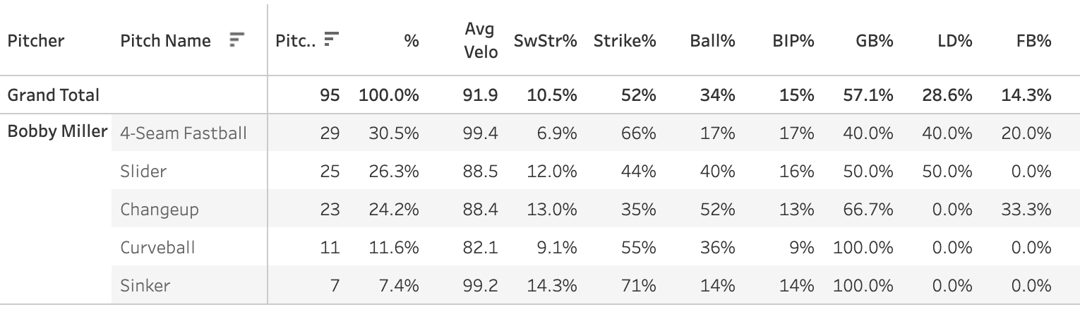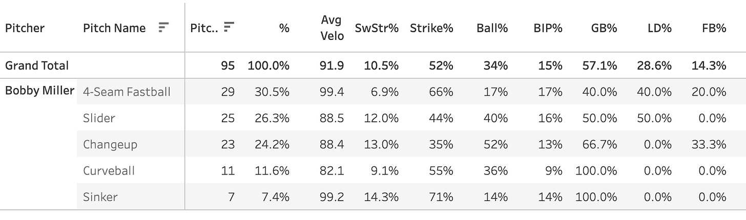 Plenty of interesting names took the bump last night, let’s start with Bobby Miller, who pitched well against the Braves going 5 innings and giving up just one run on four hits with five strikeouts and one walk.