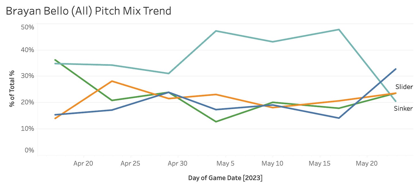 Brayan Bello...……….....(BOS)...98 Pitches....12.2 SwStr%...46.9 Strike%...31.6 Ball%...21.4 BIP%