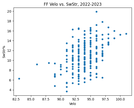 ffdata.plot.scatter(x='Velo',y='SwStr%',title='FF Velo vs. SwStr, 2022-2023')