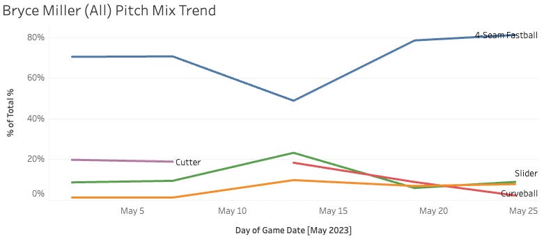 It might sound dumb and crazy, but after looking at Bobby Miller yesterday and the contrast his pitch arsenal has with Bryce’s, I think I would take Bobby for the rest of the season. That guy has four pitches, all with good pitch modeling metrics, and four is a lot bigger of a number than one.