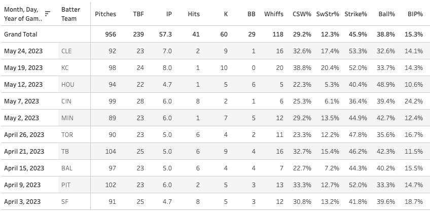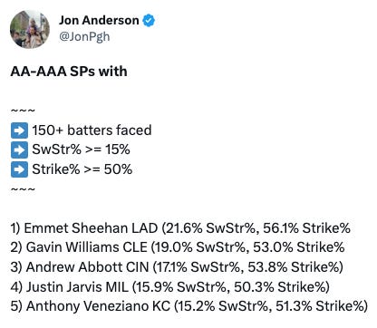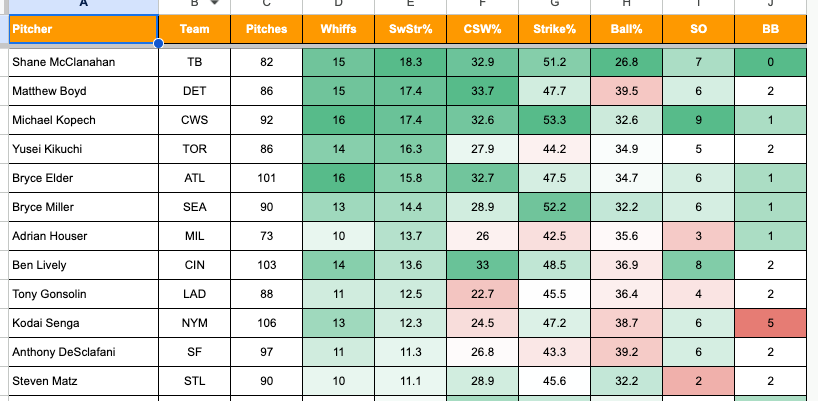I also scrapped the thing I showed yesterday where I was showing SwStr%, Strike%, Ball%, and BIP% for every SP from the day before. I have changed it to just be a Strike% leaderboard, and I took the top 15 rather than the top 10. So CSW% is gone from these notes, but it’s still on the dashboard and it’s on the new google sheet report I developed yesterday for paid subs that looks like like this: