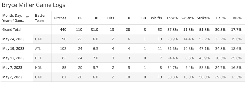 Bryce Miller also had another good outing with six scoreless innings against the Athletics. Six strikeouts, one walk.