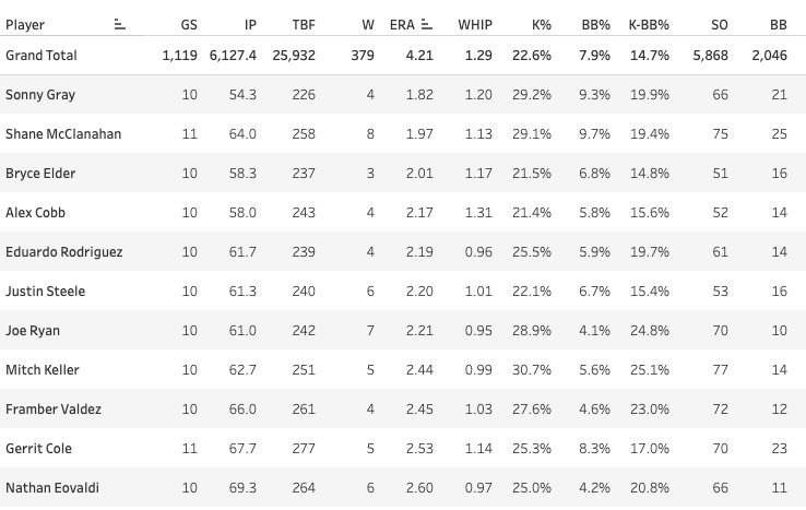 7. Joe Ryan (MIN): 49.5 Strike%, 32.7 Ball%
