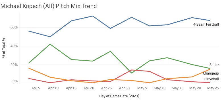 After his first start I was like damn that guy throws a lot of fastballs he should probably take it easy on that, and then I mentioned how I bet he would reduce the fastball usage moving forward since he probably just wanted to keep it simple in his first outing, but NOPE - the four-seam usage has gone UP.