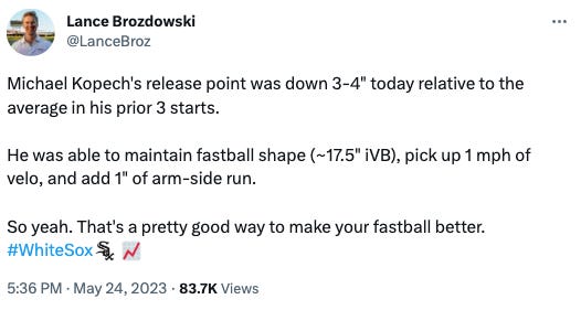 I’m not very quick to buy into release point and “shape” stuff. If it were as simple as changing a release point and a shape to make a pitch way better, I would think any given pitcher would have already done that - but that’s not a great argument on my part and maybe this is Kopech finally figuring something out with the fastball.