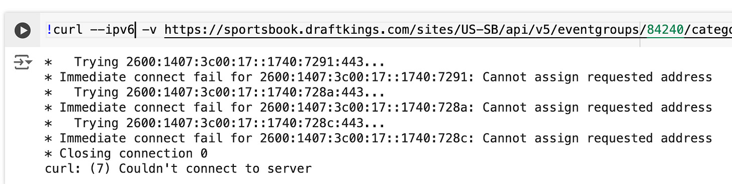 But now I’m finding something. An IPv6 request doesn’t work but an IPv4 request does!