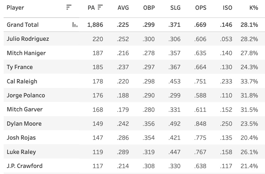 Great stuff from Gore who capitalized on the Mariners’ 28% team strikeout rate. That’s insane. I really thought the Mariners would turn into a league-average-ish matchup as we got further into the season, but they continue to just get crushed. Here are their regulars and each guy’s strikeout rate.